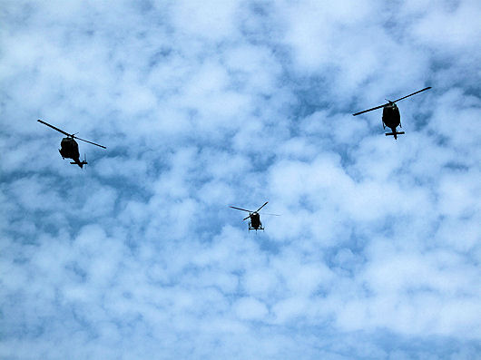 The fly-over was conducted not by jet planes but by helicopters which have the advantage of being able to hold up and wait until just the right moment.