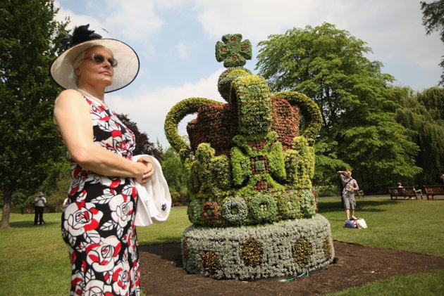 Members of the public admire a large floral crown made to celebrate the Diamond Jubilee of Her Majesty Queen Elizabeth II in St James's Park on May 29, 2012 in London, England. The four meter high floral crown took five weeks to construct and weighs approximately five tonnes; it was constructed in Cornwall using 13,500 individual plants.